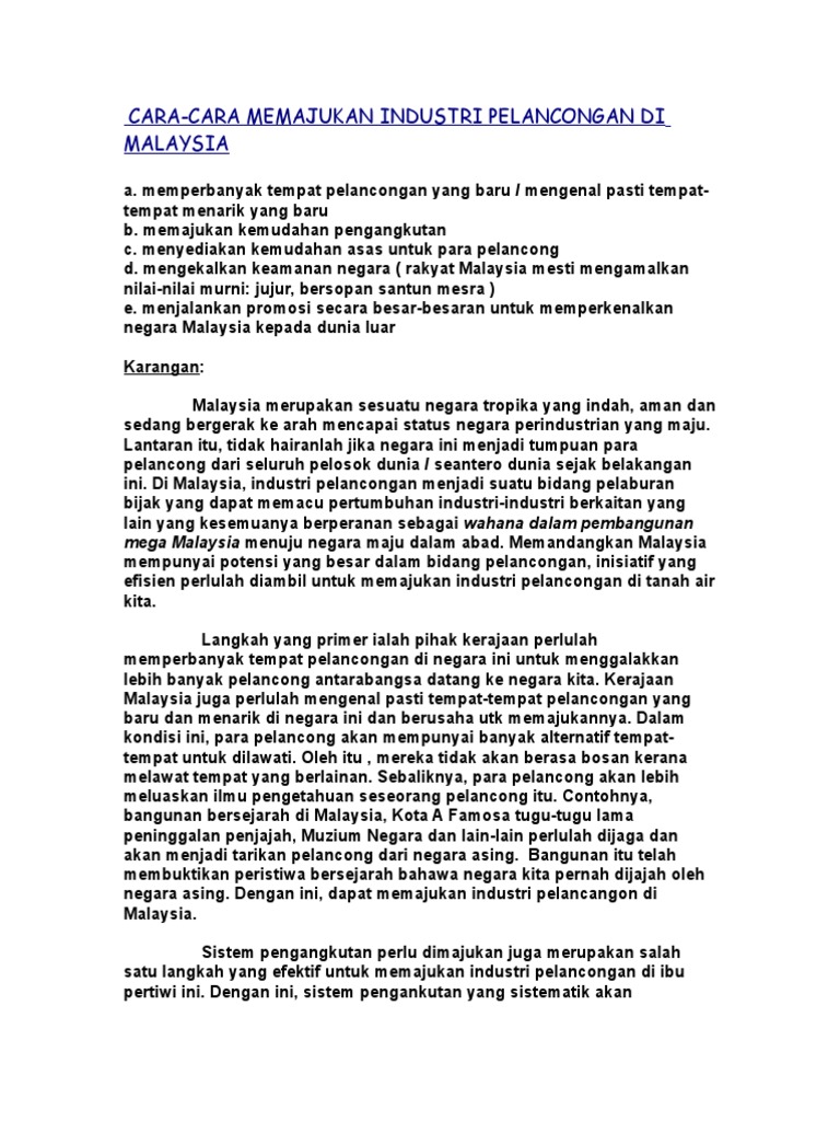 CARA-CARA MEMAJUKAN INDUSTRI PELANCONGAN DI MALAYSIA a. Contoh karangan cara meningkatkan taraf industri pelancongan negara. 15062022 ini membuktikan kecekapan mhtc dalam memainkan peranannya sebagai agensi yang memajukan dan membantu menyelaras industri pelancongan kesihatan malaysia katanya kepada bernama.